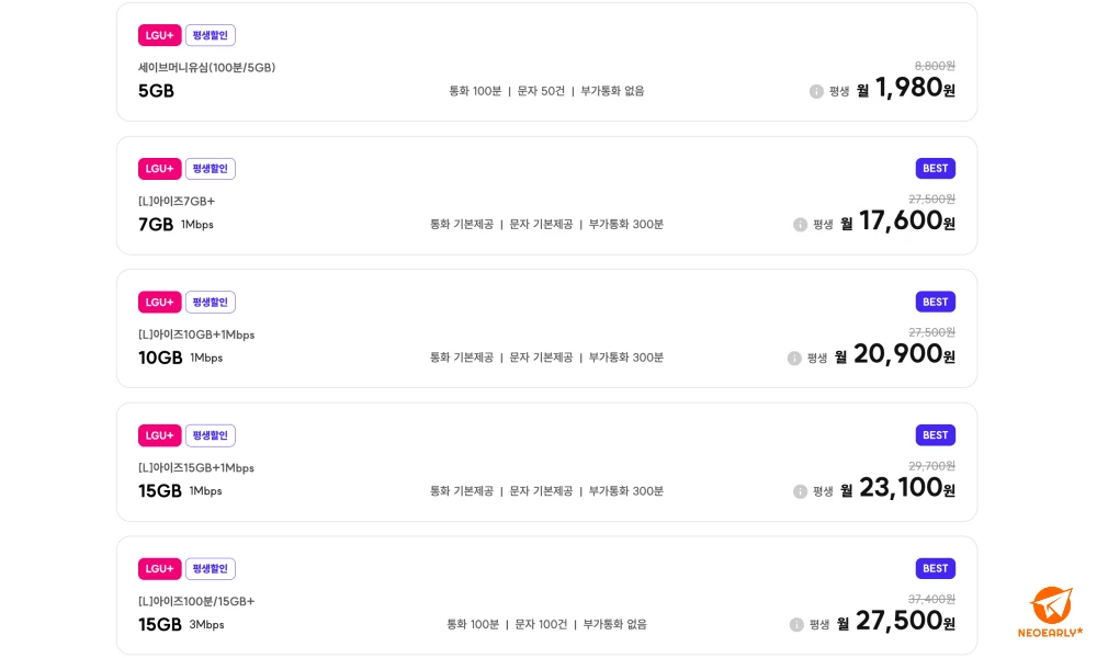 KT์ชฝ ์์ด์ฆ๋ชจ๋ฐ์ผ ์๊ธ์ ๋ ๋ฐ์ดํฐ 3GB+ํตํ 100๋ถ+๋ฌธ์ 100๊ฑด ์กฐํฉ์ผ๋ก ์ 4,430์, ๋ฐ์ดํฐ 10GB+ํตํ 200๋ถ+๋ฌธ์ 100๊ฑด ์กฐํฉ์ผ๋ก ์ 9,230์, ๋ฐ์ดํฐ 9GB+ํตํ 300๋ถ+๋ฌธ์ 100๊ฑด ์กฐํฉ์ผ๋ก ์ 9,000์, ๋ฐ์ดํฐ 9GB+ํตํ 200๋ถ+๋ฌธ์ 100๊ฑด ์กฐํฉ์ผ๋ก ์ 8,640์, ๋ฐ์ดํฐ 8GB+ํตํ 300๋ถ+๋ฌธ์ 100๊ฑด ์กฐํฉ์ผ๋ก ์ 8,310์ ๋ฑ์ ์๊ธ์ ์ธ์๋ ๋ค์ํ๊ฒ ์ค๋น๋์ด ์์๊ณ ์. LG U+์ชฝ์ ๋ฐ์ดํฐ 5GB+ํตํ 100๋ถ+๋ฌธ์ 50๊ฑด ์กฐํฉ์ผ๋ก 1,980์, ๋ฐ์ดํฐ 7GB+ํตํ ๊ธฐ๋ณธ(๋ถ๊ฐํตํ 300๋ถ)+๋ฌธ์ ๊ธฐ๋ณธ ์กฐํฉ์ผ๋ก 17,600์, ๋ฐ์ดํฐ 10GB(์ดํ 1Mbps ๋ฌด์ ํ)+ํตํ ๊ธฐ๋ณธ(๋ถ๊ฐํตํ 300๋ถ)+๋ฌธ์ ๊ธฐ๋ณธ ์กฐํฉ์ผ๋ก 20,900์, 15GB(์ดํ 1Mbps ๋ฌด์ ํ)+ํตํ ๊ธฐ๋ณธ(๋ถ๊ฐํตํ 300๋ถ)+๋ฌธ์ ๊ธฐ๋ณธ ์กฐํฉ์ผ๋ก 23,100์, 15GB(์ดํ 3Mbps ๋ฌด์ ํ)+ํตํ 100๋ถ+๋ฌธ์ 100๊ฑด ์กฐํฉ์ผ๋ก 27,500์ ๋ฑ์ผ๋ก ๋ค์ํ๋ ๋ณธ์ธ์ ์ฌ์ฉ ํจํด์ ์ฐพ์์ ์ด์ฉํด ๋ณด์ธ์.