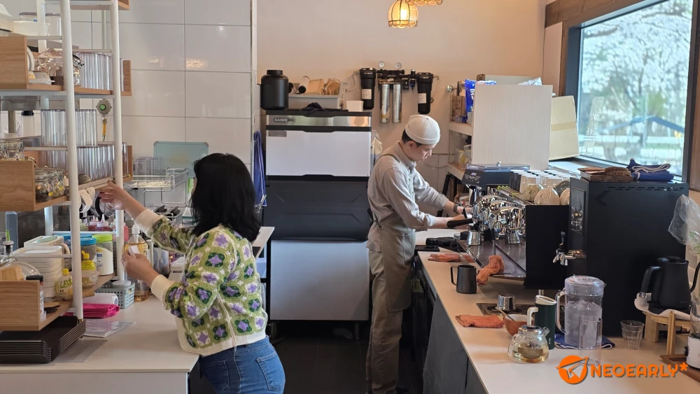 ์นดํŽ˜ ๊ฐ€์˜จ, ์•„๋ฆ„๋“œ๋ฆฌ ๋ฒš๊ฝƒ ๋ฐฐ๊ฒฝ์œผ๋กœ ์‚ฐ์†์— ๋จธ๋ฌธ ํ˜ธ์ “ํ•œ ํ•œ์˜ฅ ๋ธŒ๋Ÿฐ์น˜์นดํŽ˜