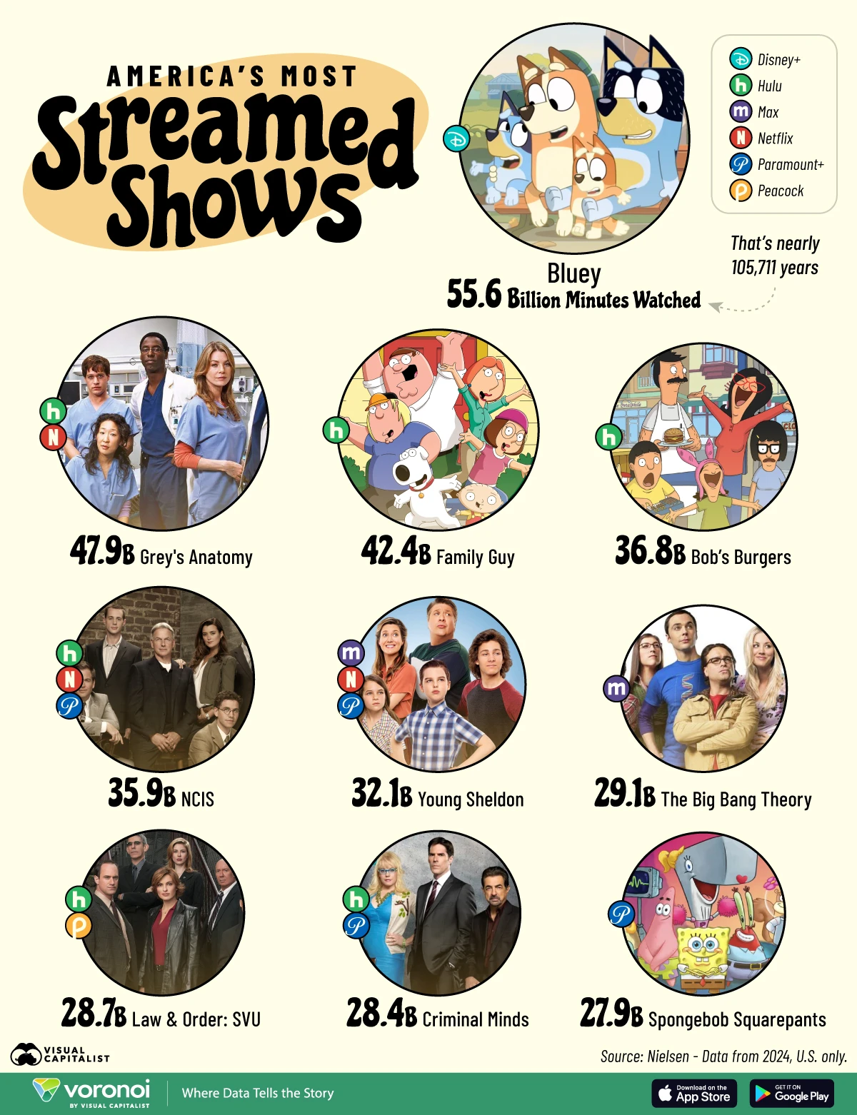 ๋ถ๋์ธ 556์ต ๋ถ์ด ์ฌ์๋์ด ์ ์์ ์ฐจ์งํ๋๋ฐ 2์์ ๊ฒฉ์ฐจ๋ ์ ๋ฒ ๋ฉ๋๋ค. 2์๋ ํ๋ฃจ์ ๋ทํ๋ฆญ์ค๋ก ์๋น์ค๋๊ณ 479์ต ๋ถ ์ฌ์๋ ๊ทธ๋ ์ด ์๋ํ ๋ฏธ(Grey's Anatomy), 3์๋ ํ๋ฃจ์์ ์๋น์ค๋๋ ํจ๋ฐ๋ฆฌ ๊ฐ์ด(Family Guy)๋ก 424์ต ๋ถ ์ฌ์๋๊ณ ์. 4์๋ ํ๋ฃจ์์ ์๋น์ค๋๋ 368์ต ๋ถ ์ฌ์๋ ๋ฐฅ์ค ๋ฒ๊ฑฐ(Bob's Burgers), 5์๋ ํ๋ฃจ, ๋ทํ๋ฆญ์ค, ํ๋ผ๋ง์ดํธ ํ๋ฌ์ค์์ ์๋น์ค๋ NCIS๋ก 359์ต ๋ถ ์ฌ์๋์ต๋๋ค.