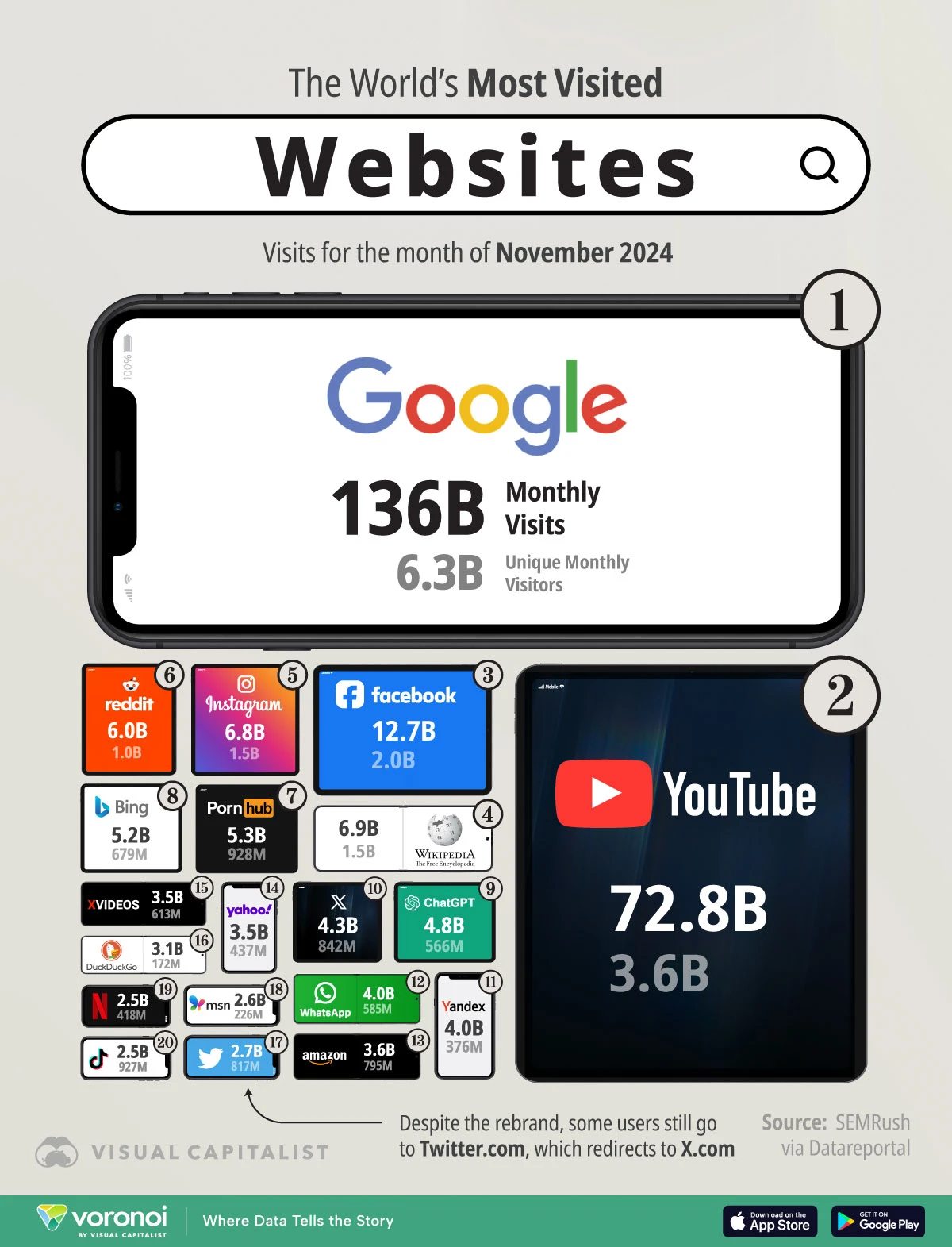 Key Takeaways Google continues to reign supreme as the world's most visited website, with 136 billion monthly visits in November 2024. Ranking in secon…