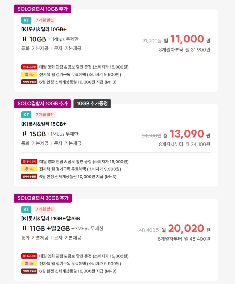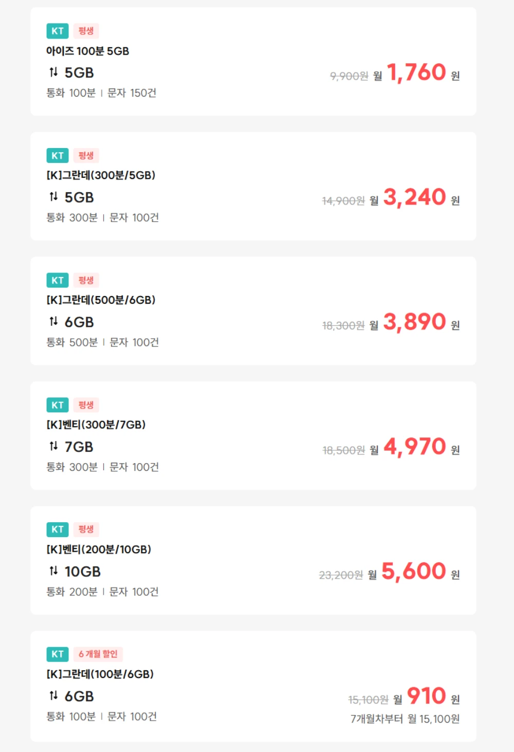 μ΄μ΄μ KTλ§ μκΈμ λ λ°μ΄ν° 5GB+ν΅ν 100λΆ+λ¬Έμ 150건 μ‘°ν©μΌλ‘ νμ ν μΈλλ μμ΄μ¦ 100λΆ 5GB μκΈμ κ° μ 1,760μ, λ°μ΄ν° 5GB+ν΅ν 300λΆ+λ¬Έμ 100건 μ‘°ν©μΌλ‘ νμ ν μΈλλ [K]κ·Έλλ°(300λΆ/5GB) μκΈμ κ° μ 3,240μ, λ°μ΄ν° 6GB+ν΅ν 500λΆ+λ¬Έμ 100건 μ‘°ν©μΌλ‘ νμ ν μΈλλ [K]κ·Έλλ°(500λΆ/6GB) μκΈμ κ° μ 3,980μ, λ°μ΄ν° 7GB+ν΅ν 300λΆ+λ¬Έμ 100건 μ‘°ν©μΌλ‘ νμ ν μΈλλ [K]λ²€ν°(300λΆ/7GB) μκΈμ κ° μ 4,970μ, λ°μ΄ν° 10GB+ν΅ν 200λΆ+λ¬Έμ 100건 μ‘°ν©μΌλ‘ νμ ν μΈλλ [K]λ²€ν°(200λΆ/10GB) μκΈμ κ° μ 5,600μ, λ°μ΄ν° 6GB+ν΅ν 100λΆ+λ¬Έμ 100건 μ‘°ν©μΌλ‘ 6κ°μ ν μΈλλ [K]κ·Έλλ°(100λΆ/6GB) μκΈμ κ° μ 910μμ΄κ³ μ.