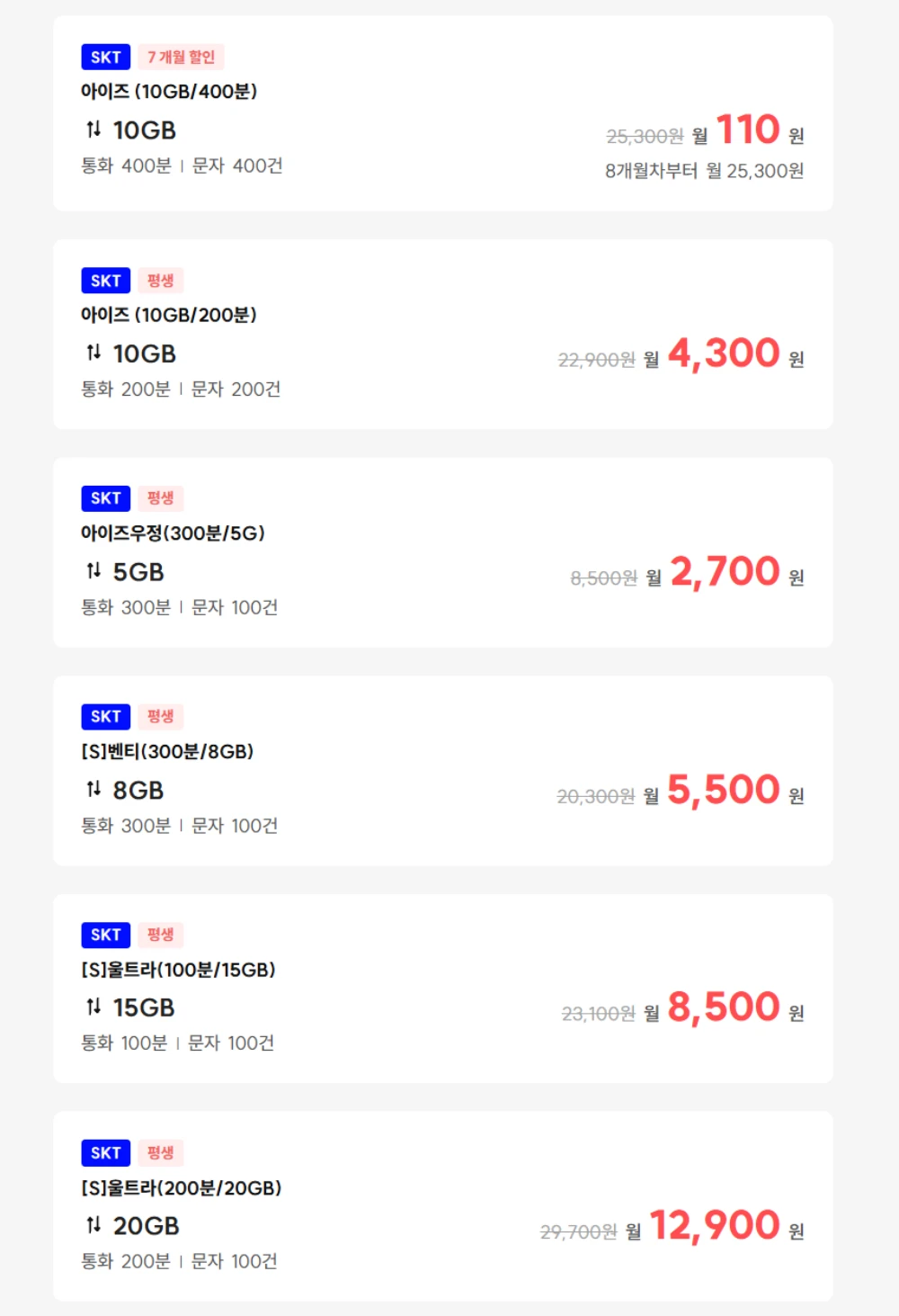 SKTλ§ μκΈμ λΆν° μ΄ν΄λ³΄λ©΄ λ°μ΄ν° 10GB+ν΅ν 400λΆ+λ¬Έμ 400건 μ‘°ν©μΌλ‘ 7κ°μ ν μΈλλ μμ΄μ¦(10GB/400λΆ) μκΈμ κ° μ 110μ, λ°μ΄ν° 10GB+ν΅ν 200λΆ+λ¬Έμ 200건 μ‘°ν©μΌλ‘ νμ ν μΈλλ μμ΄μ¦(10GB/200λΆ) μκΈμ κ° μ 4,300μ, λ°μ΄ν° 5GB+ν΅ν 300λΆ+λ¬Έμ 100건 μ‘°ν©μΌλ‘ νμ ν μΈλλ μμ΄μ¦μ°μ (300λΆ/5G) μκΈμ κ° μ 2,700μ, λ°μ΄ν° 8GB+ν΅ν 300λΆ+λ¬Έμ 100건 μ‘°ν©μΌλ‘ νμ ν μΈλλ [S]λ²€ν°(300λΆ/8GB) μκΈμ κ° μ 5,500μ, λ°μ΄ν° 15GB+ν΅ν 100λΆ+λ¬Έμ 100건 μ‘°ν©μΌλ‘ νμ ν μΈλλ [S]μΈνΈλΌ(100λΆ/15GB) μκΈμ κ° μ 8,500μ, λ°μ΄ν° 20GB+ν΅ν 200λΆ+λ¬Έμ 100건 μ‘°ν©μΌλ‘ νμ ν μΈλλ [S]μΈνΈλΌ(200λΆ/20GB) μκΈμ κ° μ 12,900μμΌλ‘ μ€λΉλμ΄ μμ΅λλ€.