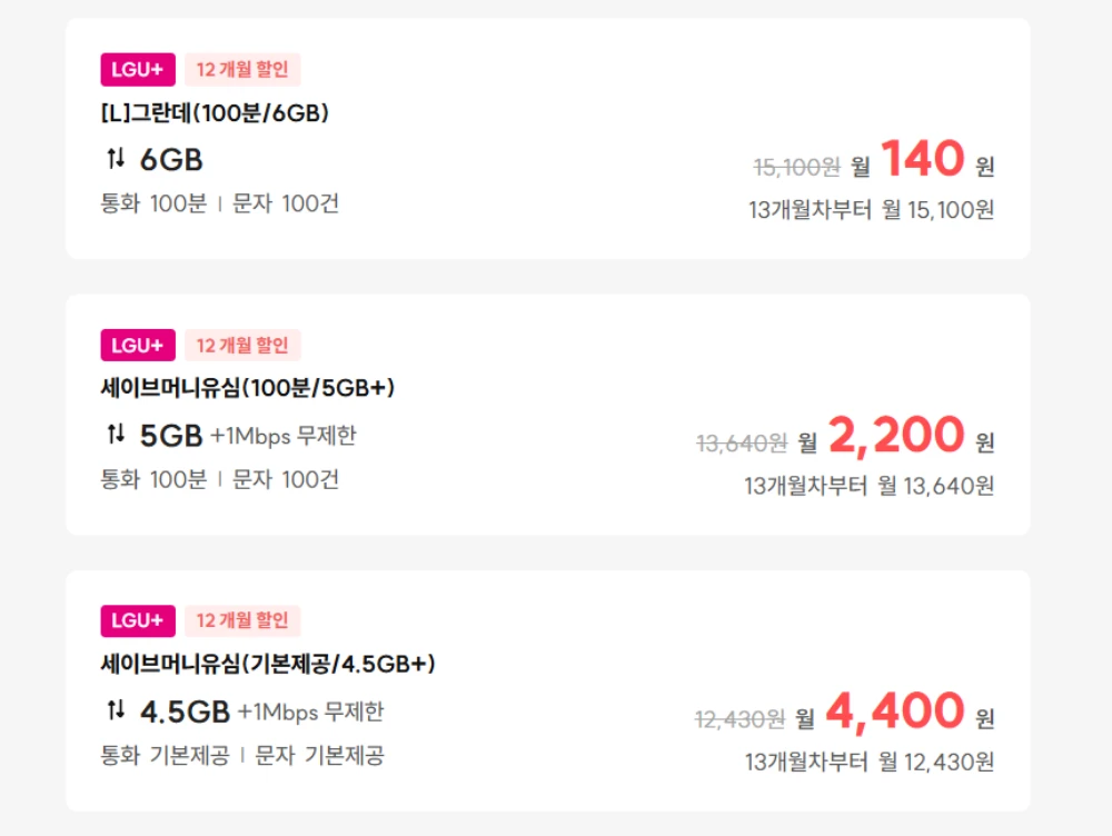 λ§μ§λ§μΌλ‘ LG U+λ§ μκΈμ λ λ°μ΄ν° 6GB+ν΅ν 100λΆ+λ¬Έμ 100건 μ‘°ν©μΌλ‘ 12κ°μ ν μΈλλ [L]κ·Έλλ°(100λΆ/6GB) μκΈμ κ° μ 140μ, λ°μ΄ν° 5GB(μ΄ν 1Mbps 무μ ν)+ν΅ν 100λΆ+λ¬Έμ 100건 μ‘°ν©μΌλ‘ 12κ°μ ν μΈλλ μΈμ΄λΈλ¨Έλμ μ¬(100λΆ/5GB+) μκΈμ κ° μ 2,200μ, λ°μ΄ν° 4.5GB(μ΄ν 1Mbps 무μ ν)+ν΅ν κΈ°λ³Έ+λ¬Έμ κΈ°λ³Έ μ‘°ν©μΌλ‘ 12κ°μ ν μΈλλ μΈμ΄λΈλ¨Έλμ μ¬(κΈ°λ³Έμ 곡/4.5GB+) μκΈμ κ° μ 4,400μ λ±μ΄ μ€λΉλμ΄ μμ΅λλ€.