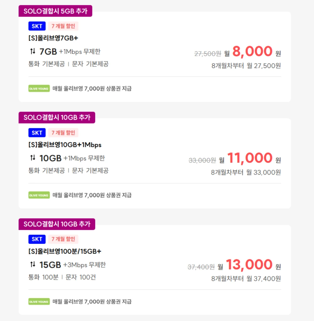 SKTλ§ μκΈμ λΆν° μ΄ν΄λ³΄λ©΄ λ°μ΄ν° 10GB+ν΅ν 400λΆ+λ¬Έμ 400건 μ‘°ν©μΌλ‘ 7κ°μ ν μΈλλ μμ΄μ¦(10GB/400λΆ) μκΈμ κ° μ 110μ, λ°μ΄ν° 10GB+ν΅ν 200λΆ+λ¬Έμ 200건 μ‘°ν©μΌλ‘ νμ ν μΈλλ μμ΄μ¦(10GB/200λΆ) μκΈμ κ° μ 4,300μ, λ°μ΄ν° 5GB+ν΅ν 300λΆ+λ¬Έμ 100건 μ‘°ν©μΌλ‘ νμ ν μΈλλ μμ΄μ¦μ°μ (300λΆ/5G) μκΈμ κ° μ 2,700μ, λ°μ΄ν° 8GB+ν΅ν 300λΆ+λ¬Έμ 100건 μ‘°ν©μΌλ‘ νμ ν μΈλλ [S]λ²€ν°(300λΆ/8GB) μκΈμ κ° μ 5,500μ, λ°μ΄ν° 15GB+ν΅ν 100λΆ+λ¬Έμ 100건 μ‘°ν©μΌλ‘ νμ ν μΈλλ [S]μΈνΈλΌ(100λΆ/15GB) μκΈμ κ° μ 8,500μ, λ°μ΄ν° 20GB+ν΅ν 200λΆ+λ¬Έμ 100건 μ‘°ν©μΌλ‘ νμ ν μΈλλ [S]μΈνΈλΌ(200λΆ/20GB) μκΈμ κ° μ 12,900μμΌλ‘ μ€λΉλμ΄ μμ΅λλ€.