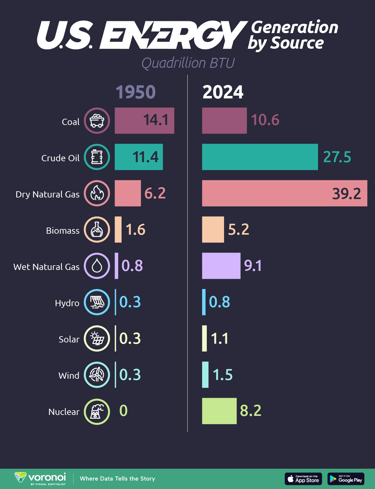 This chart uses data from the U.S. Energy Information Administration to show how energy generation in the country has shifted since 1950. ๐ญโ ๐ โก…