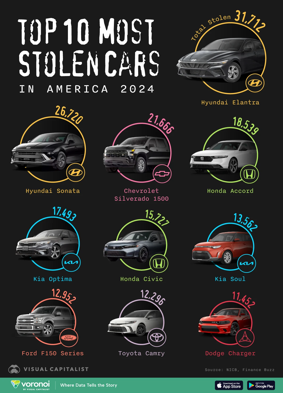 FinanceBuzz compiled car theft data from all 50 states to analyze the most commonly stolen cars in America. Find out which make and model is most at risk.