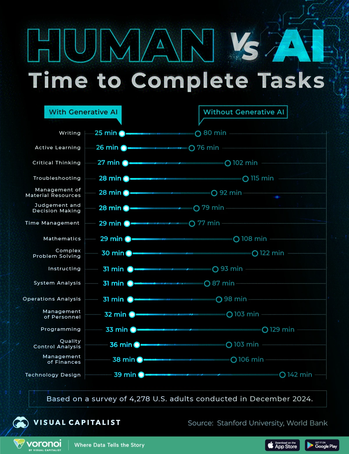 What We're Showing This chart compares the average time (in minutes) it takes U.S. adults to complete 18 common work tasks with and without generative AI t…
