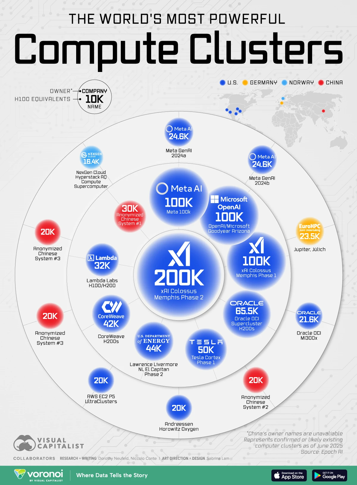 Epoch AIμ 2025λ 6μ λ°μ΄ν°λ₯Ό λ°νμΌλ‘ voronoiκ° μ 리ν μ΄ μΈν¬κ·Έλν½μ AI μλ κ΅°λΉ κ²½μμ κ·λͺ¨λ₯Ό κ°λ μΌ νλλ°μ. νμ€ν κ²λ³΄λ€λ μΆμΈ‘ν λ°μ΄ν°κ° λ λ§κΈ°λ νμ§λ§, μΈκ³μμ κ°μ₯ κ°λ ₯ν AIμ© μ»΄ν¨ν ν΄λ¬μ€ν°κ° 무μμΈμ§ ν λ² μ΄ν΄λ³ΌκΉμ? μ¬κΈ° μΈκΈλ μ£Όμ μ»΄ν¨ν ν΄λ¬μ€ν°λ€μ μλΉλμμ H100 μΉ©μ μ±λ₯μ κΈ°λ°μΌλ‘ ν΄λΉ μΉ©μ΄ μ΄λ μ λ μ¬μ©λμ λμ μ±λ₯μ κ°μ§κ³ μλμ§λ‘ κ·λͺ¨λ₯Ό λΉκ΅νκ³ μλ€λ κ±Έ μ°Έκ³ νμκΈ° λ°λλλ€. H100μ΄ λ²€μΉλ§ν¬μ λ°λ‘λ―Έν°κ° λκ³ μλ μ μ΄μ£ .