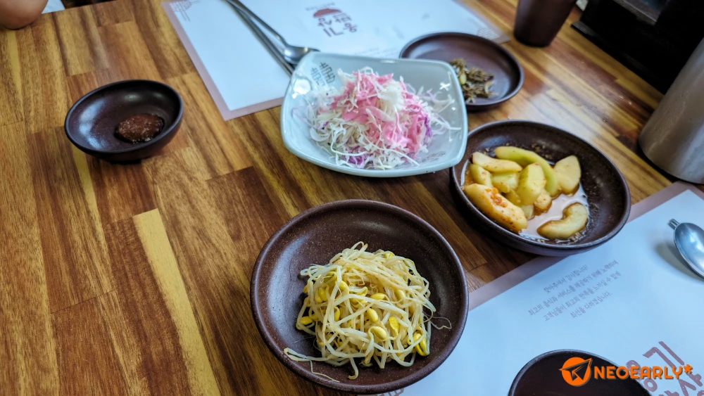 ๋Œ€๊ธฐ์„์—์„œ ์ž ๊น ๋ชจ๋ฐ”์ผ ๊ฒŒ์ž„์œผ๋กœ ์‹œ๊ฐ„์„ ๋ณด๋‚ด๋Š” ์‚ฌ์ด ์ €ํฌ ์ฐจ๋ก€๊ฐ€ ๋˜์–ด ์•ˆ๋‚ด๋ฐ›์€ ํ…Œ์ด๋ธ”์— ์•‰์Šต๋‹ˆ๋‹ค. ๋ฉ”๋‰ด ์„ ํƒ์ด ํ•„์š” ์—†์œผ๋‹ˆ ๋ฐ”๋กœ ํ…Œ์ด๋ธ” ์œ„์— ๋ฐ˜์ฐฌ์ด ๊น”๋ฆฌ๊ธฐ ์‹œ์ž‘ํ•˜๋”๊ตฐ์š”. ๋œ์žฅ์„ ๋ฒ ์ด์Šค๋กœ ํ•œ ๋ฏธ์—ญ๊ตญ, ๊ฐˆ์น˜์†์ “, ๊น€์น˜, ์ฝฉ๋‚˜๋ฌผ์— ์žฅ์•„์ฐŒ ๊ฐ™์€ ๋ฐ‘๋ฐ˜์ฐฌ๊ณผ ์Œˆ์žฅ, ๊นป์žŽ ๋“ฑ์˜ ์Œˆ์ฑ„์†Œ ๋“€์˜ค. ๋ฉ”์ธ ๋ฐ˜์ฐฌ์ด๋ž„ ์ˆ˜ ์žˆ๋Š” ๊ธฐ๋ฆ„์— ํŠ€๊ฒจ๋‚ธ ๋“ฏํ•œ ์˜ฅ๋”๊ตฌ์ด, ๋„๋งˆ ์—†์ด(?) ๋‚˜์˜ค๋Š” ํ‘๋ผ์ง€์ˆ˜์œก, ์ ๋‹นํžˆ ๋งค์ฝคํ•œ ์˜ค์ง•์–ด๋ณถ์Œ. ๊ทธ๋ฆฌ๊ณ  ๋ฝ€์–—๊ฒŒ ์ž˜ ์ง€์–ด์ง„ ๋Œ์†ฅ๋ฐฅ๊นŒ์ง€ ์„ธํŒ… ์™„๋ฃŒ.