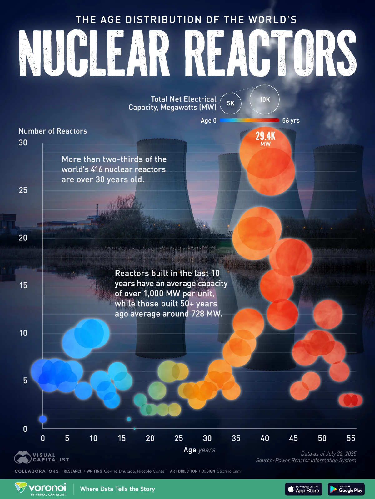 What We're Showing This chart visualizes the age and electrical capacity of the world’s 416 nuclear reactors, using data from the Power Reactor Information…