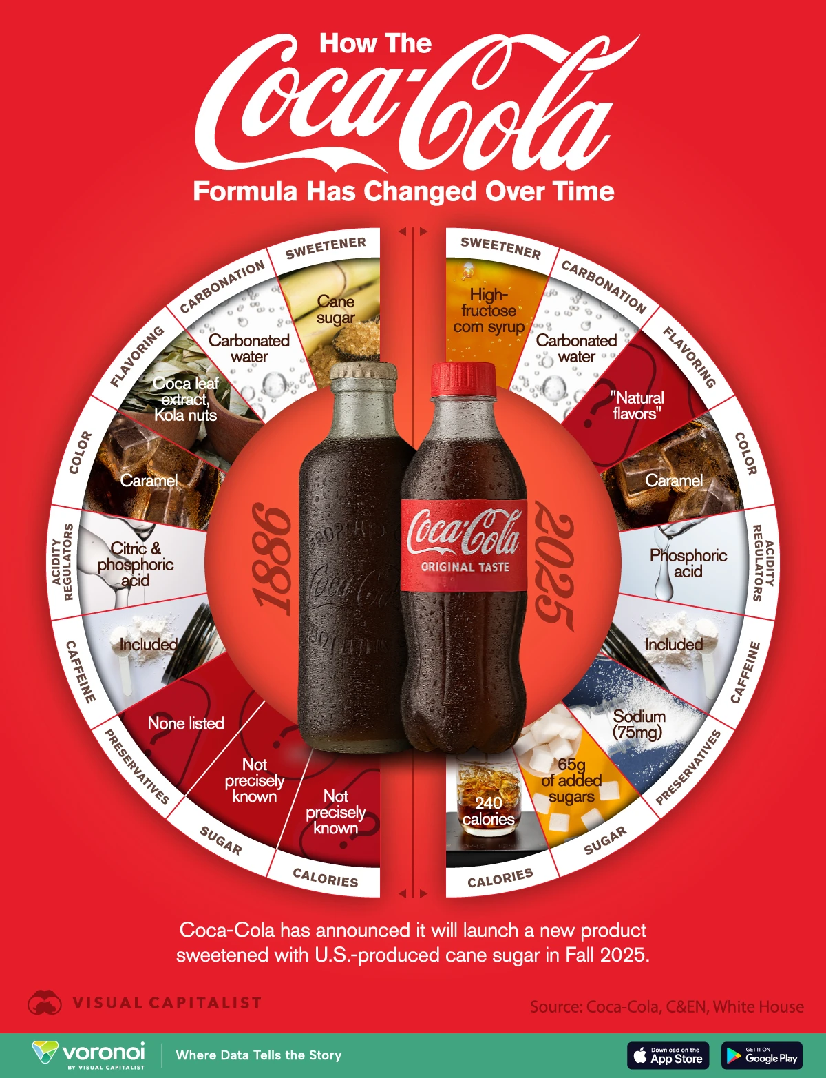 1886 vs 2025 ์ฝ์นด์ฝ๋ผ ๋น๋ฐ(?) ์ฑ๋ถ ๊ตฌ์ฑ ๋ณํ by voronoiapp.com