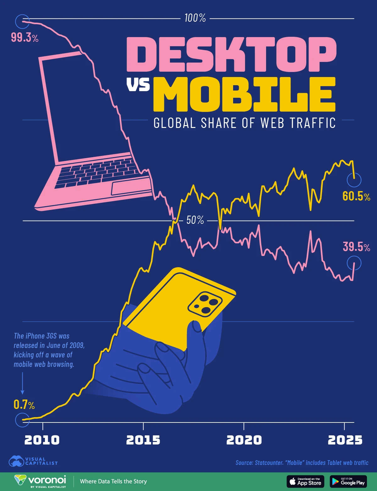 What We’re Showing This line chart compares the global share of web traffic from desktop vs. mobile devices between 2009 to mid-2025. The data from Statco…