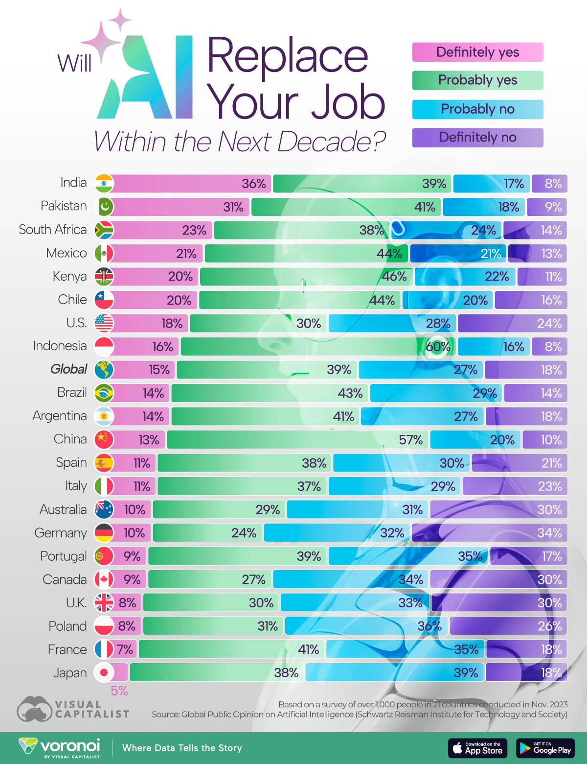 People in 21 Countries Were Asked if They Think AI Will Replace Their Job