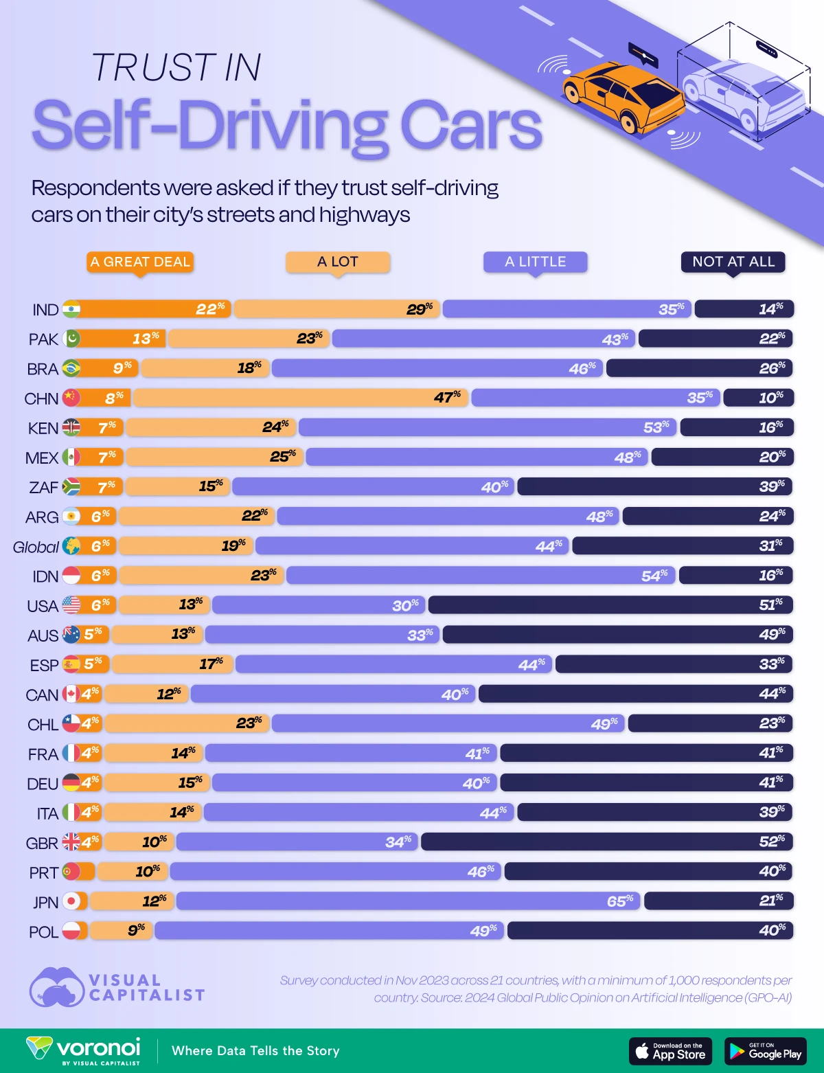 Key takeaways Trust in self-driving cars is highest in emerging markets like India , Pakistan , Brazil , and China , where larger shares ex…