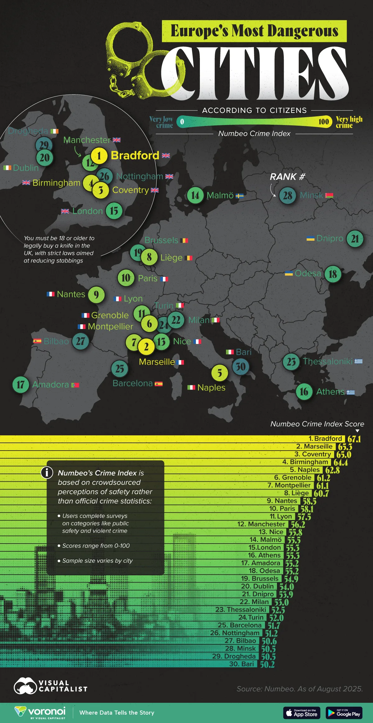μ λ½μμ κ°μ₯ μνν λμλ‘ νμ§μΈμκ² μ μ λ κ³³μ μκ΅ λΈλλνΌλ(67.1)μμ΅λλ€. μ΄μ΄μ νλμ€ λ§λ₯΄μΈμ (65.3), μκ΅ μ½λ²νΈλ¦¬(65), μκ΅ λ²λ°μ(64.4), μ΄ν리μ λν΄λ¦¬(62.8), νλμ€ κ·Έλ₯΄λ ΈλΈ(61.2), νλμ€ λͺ½ν 리μ(61.1), 벨기μ 리μμ£Ό(60.7), νλμ€ λνΈ(58.5), νλμ€ ν리(58.1), νλμ€ λ¦¬μΉ(57.5), μκ΅ λ§¨μ²΄μ€ν°(56.2), νλμ€ λμ€(55.8), μ€μ¨λ΄ λ§λ«Ό(55.5), μκ΅ λ°λ(55.3), κ·Έλ¦¬μ€ μν λ€(55.3), ν¬λ₯΄ν¬κ° μλ§λλΌ(55.2), μ°ν¬λΌμ΄λ μ€λ°μ¬(55.2), 벨기μ λΈλ€Όμ (54.9), μμΌλλ λλΈλ¦°(54), μ°ν¬λΌμ΄λ λλνλ‘(53.9), μ΄ν리μ λ°λΌλ Έ(53), κ·Έλ¦¬μ€ ν μ΄λ‘λν€(52.5), μ΄ν리μ ν λ¦¬λ Έ(52), μ€νμΈ λ°λ₯΄μ λ‘λ(51.7), μκ΅ λ Έν μ(51.2), μ€νμΈ λΉλ°μ€(50.6), 벨λ‘루μ λ―Όμ€ν¬(50.5), μμΌλλ λλ‘μ΄λ€(50.5), μ΄ν리μ λ°λ¦¬(50.2) λ±μ΄ μμ 30κ° λμλ‘ κΌ½νμ΅λλ€.