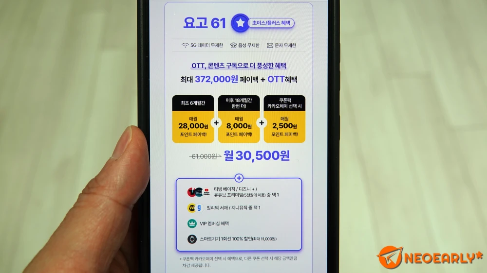 ๋ค๋ฅธ ์ ํ์ง์ธ ์๊ณ 61 ์ด์ด์ค/ํ๋ฌ์ค ํํํ์ ํฐ๋น ๋ฒ ์ด์ง/๋์ฆ๋+/์ ํ๋ธ ํ๋ฆฌ๋ฏธ์(5,000์์ ์ด์ฉ) ์ค ํ ๊ฐ์ง, ๋ฐ๋ฆฌ์ ์์ฌ/์ง๋๋ฎค์ง ์ค ํ ๊ฐ์ง ๋ฑ OTT์ ์ฝํ ์ธ ์๋น์ค์ ๋ฐฉ์ ์ด ์ฐํ ์๋๋ฐ์. ์ด์ด์ค/ํ๋ฌ์ค ํํํ์๋ ํฌ์ธํธ ํ์ด๋ฐฑ์ ์์ด์ 6๊ฐ์๊ฐ 28,000์, 18๊ฐ์๊ฐ 8,000์, ์ฟ ํฐํฉ์ผ๋ก ์นด์นด์คํ์ด๋ฅผ ์ ํํ๋ฉด 2,500์์ฉ ๋ํด์ ์ต๋ 372,000์ ํ์ด๋ฐฑ๊ณผ VIP ๋ฉค๋ฒ์ญ, ์ค๋งํธ ๊ธฐ๊ธฐ 1ํ์ ํ ์ธ ๋ฑ์ ๋ฐ์ ์ ์์ต๋๋ค. ์ 30,500์์ผ๋ก ์กฐ๊ธ ๋ ๋ด์ผ ํ์ง๋ง, OTT/์ฝํ ์ธ ๊ฐ ์์ผ๋ ์ทจํฅ๋๋ก ์ ํํ๋ฉด ๋๋ ๊ฑฐ์ฃ .