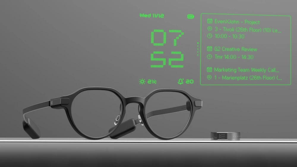 Discover Even G2 smart glasses with display, featuring automatic AI prompts, smart ring control & designer frames. Explore Teleprompt, Translate, Health...