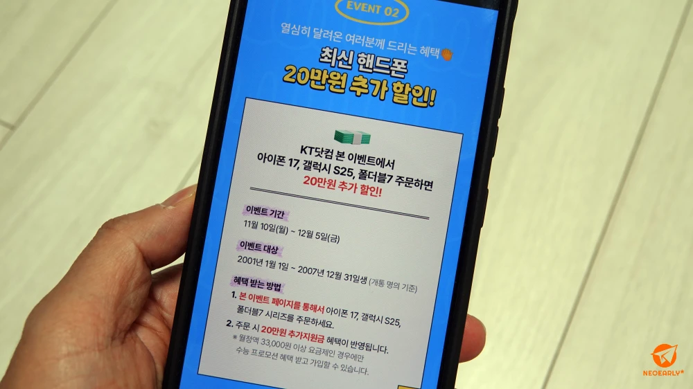 μ¬κΈ°μ KTλ·μ»΄ μ΄λ²€νΈ νμ΄μ§λ₯Ό ν΅ν΄ μμ΄ν° 17(μμ΄ν° 17, μμ΄ν° 17 νλ‘, μμ΄ν° 17 νλ‘ λ§₯μ€, μμ΄ν° μμ΄), κ°€λμ S25(κ°€λμ S25 μΈνΈλΌ, κ°€λμ S25, κ°€λμ S25 μ£μ§, κ°€λμ S25 FE), ν΄λλΈ7(κ°€λμ Z ν΄λ7, κ°€λμ Z ν립7, κ°€λμ Z ν립7 FE)μ μ£Όλ¬Ένλ©΄ 20λ§ μ μΆκ° ν μΈλ°μΌμ€ μ μλλ°μ. μμ μ‘ 33,000μ μ΄μ μκΈμ μΈ κ²½μ°μ μλ₯ νλ‘λͺ¨μ ννμ λ°κ³ κ°μ νμ€ μ μλ€λ κ² μ°Έκ³ ν΄ μ£ΌμΈμ.