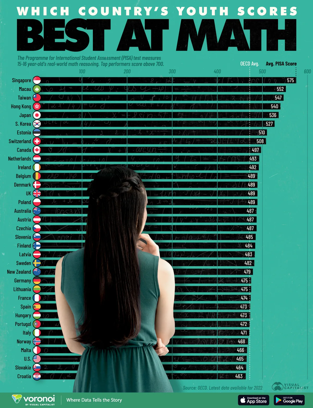 κ²½μ νλ ₯κ°λ°κΈ°κ΅¬(OECD/Organization for Economic Cooperation and Development)μ κ΅μ νμ νκ° νλ‘κ·Έλ¨(PISA/Programme for International Student Assessment)μ 2022λ κ²°κ³Όλ₯Ό λ°νμΌλ‘ voronoiκ° μ 리ν μ΄ μΈν¬κ·Έλν½μ μνμ λ°μ΄λ μ¬λμ΄ λ§μ κ΅κ°κ° μ΄λμΈμ§λ₯Ό μκ°νκ³ μμ΅λλ€. μ°Έκ³ λ‘ 15~16μΈ μ¬μ΄μ νκ· μν μ μλ₯Ό κΈ°μ€μΌλ‘ κ΅κ°μ μμλ₯Ό λ§€κΈ΄ 건λ°μ. μ΄λ€ λλΌκ° 1λ±μ μ°¨μ§νμκΉμ?