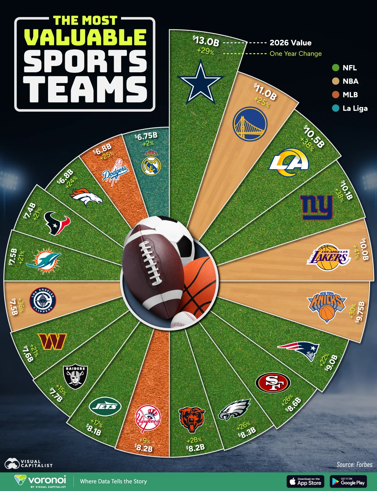 2026๋ ์ ์ธ๊ณ์์ ๊ฐ์ฅ ๋์ ๊ฐ์น๋ฅผ ์๋ํ๋ ์คํฌ์ธ ํ์ 130์ต ๋ฌ๋ฌ ๊ฐ์น๋ก ํ๊ฐ๋ NFLํ ๋๋ฌ์ค ์นด์ฐ๋ณด์ด์ค์์ต๋๋ค. ์ด์ด์ NBAํ์ธ ๊ณจ๋ ์คํ ์ดํธ ์๋ฆฌ์ด์ค๊ฐ 110์ต ๋ฌ๋ฌ, NFLํ์ธ ๋ก์ค์ค์ ค๋ ์ค ๋จ์ค๊ฐ 105์ต ๋ฌ๋ฌ, NFLํ์ธ ๋ด์ ์์ด์ธ์ธ ๊ฐ 101์ต ๋ฌ๋ฌ, NBAํ์ธ ๋ก์ค์ค์ ค๋ ์ค ๋ ์ด์ปค์ค๊ฐ 100์ต ๋ฌ๋ฌ, NBAํ์ธ ๋ด์ ๋์ค๋ 97.5์ต ๋ฌ๋ฌ, NFLํ์ธ ๋ด์๊ธ๋๋ ํจํธ๋ฆฌ์ด์ธ ๋ 90์ต ๋ฌ๋ฌ, NFLํ์ธ ์ํ๋์์ค์ฝ 49ers๋ 86์ต ๋ฌ๋ฌ์์ต๋๋ค.