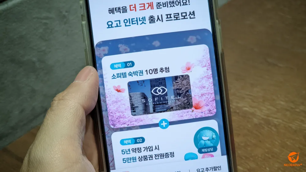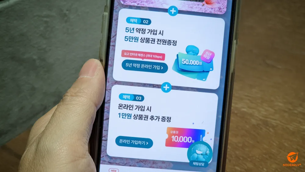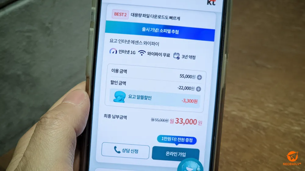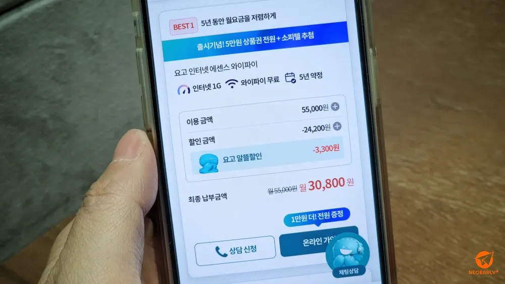 ์๋ฅผ ๋ค์ด ์๊ณ ์ธํฐ๋ท ์์ ์ค ์์ดํ์ด ์๊ธ์ ์ ๊ฐ์ ํ๋ค๋ฉด ์ธํฐ๋ท์ 1G ์๋๋ก ์ด์ฉํ ์ ์๊ณ ์์ดํ์ด๋ ์ ๊ณต๋ฉ๋๋ค. ๊ทธ ์ํ์ 5๋ ์ฝ์ ์ผ๋ก ๊ฐ์ ํ๋ค๋ฉด ์ธํฐ๋ท 55,000์+์์ดํ์ด ๋ฌด๋ฃ๋ก ์ ์ด์ฉ๋ฃ๊ฐ 55,000์์ด์ง๋ง, ์๊ณ ์ธํฐ๋ท ์ฝ์ ํ ์ธ -20,900์์ ์๊ณ ์๋ฐํ ์ธ -3,300์์ด ๋ํด์ ธ ์ 30,800์์ผ๋ก 1G ์ธํฐ๋ท์ ์ด์ฉํ ์ ์๊ฒ ๋๋๊ฑฐ์ฃ . 100M ์ธํฐ๋ท๋ง ์ด๋ค๋ฉด ์๊ณ ์ธํฐ๋ท ์ฌ๋ฆผ ์์ดํ์ด๋ก 3๋ ์ฝ์ ์ ์ธํฐ๋ท 39,600์+์์ดํ์ด 1,100์์ผ๋ก 40,700์์์ ์๊ณ ์ธํฐ๋ท ์ฝ์ ํ ์ธ -18,700์์ ์๊ณ ์๋ฐํ ์ธ -2750์์ด ๋ํด์ ธ ์ 19,250์์ผ๋ก ์ด์ฉํ ์ ์๋๊ฑฐ๊ณ ์.