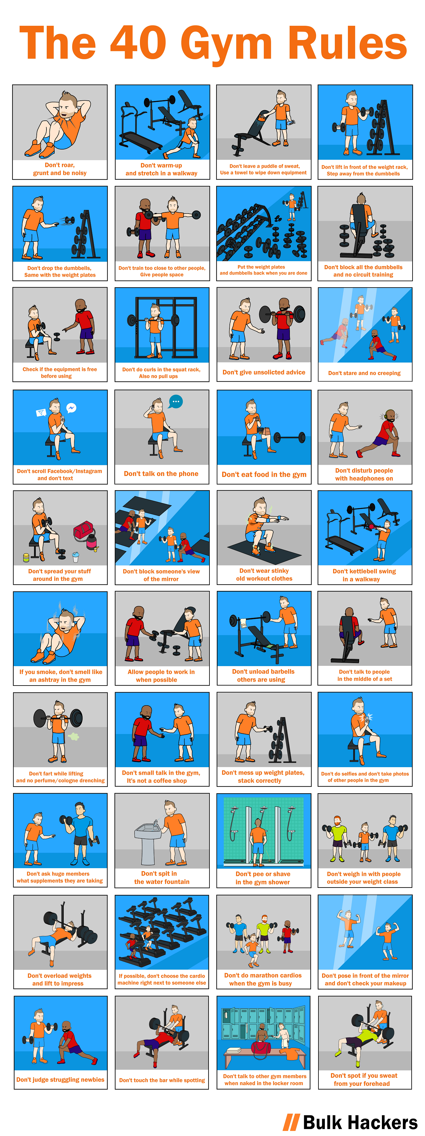 The 40 Gym Rules In the gym there are 40 unspoken rules you need to be aware of. Failing to follow these rules will make everybody else secretly hate you, wish that you would go home and never come back 😞 Share the graphic Feel free to share the graphic